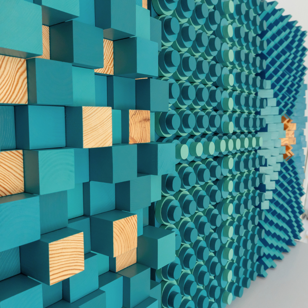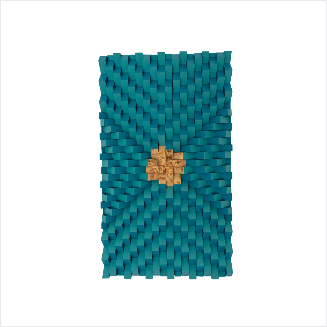 In the Feng Shui world this triptych blends the dynamic energy of triangles (representing fire - symbolizing passion, energy, transformation), the unifying harmony of circles (representing metal - symbolizing unity, completeness, and mental clarity), and the grounding stability of squares (representing earth - symbolizing stability, grounding, and balance), all enhanced by the wood element’s vitality and the renewing qualities of teal and turquoise. One can harness its feng shui properties to promote success, balance, and growth, while adding a visually striking and energetically uplifting piece to your space.